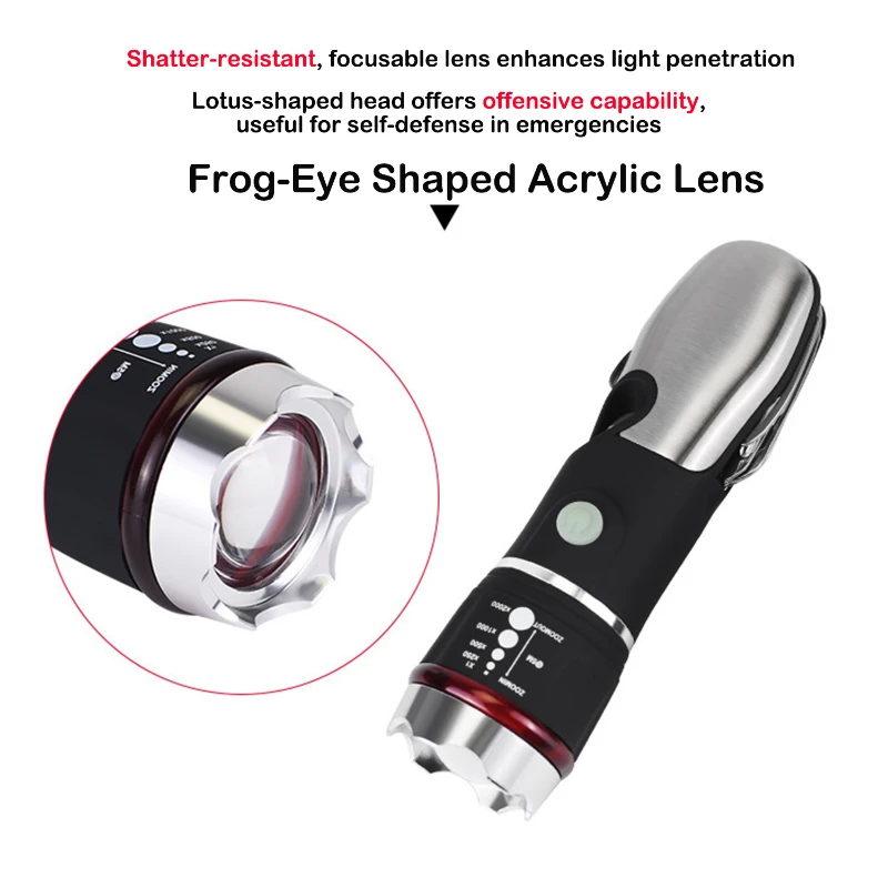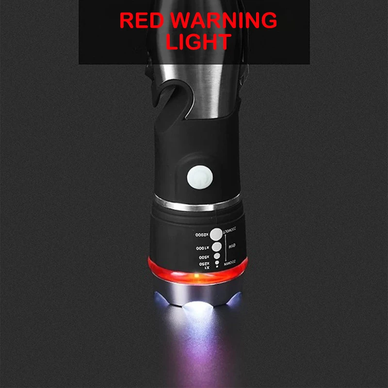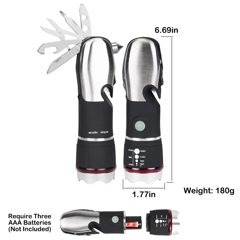The Multi-Function Safety Flashlight Tool is an essential gadget designed for emergencies and outdoor adventures. This versatile tool combines multiple functions in one compact device, including a powerful LED flashlight with adjustable focus, a red warning light, and a lotus-shaped tactical head for self-defense. Additionally, it features a seatbelt cutter, safety hammer, and a selection of handy tools like scissors, screwdrivers, and a knife. Crafted from durable ABS and stainless steel, this tool is lightweight yet sturdy, making it perfect for vehicles, camping, and home emergency kits. It is packaged in an individual color box. Powered by three AAA batteries (not included), this tool is ready for action when you need it most.
