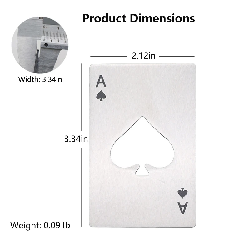 This Portable Stainless Steel Credit Card Size Bottle Opener is available in two stylish colors, black and silver, this compact and portable opener boasts dimensions of 3.35 in x 2.09 in and a weight of 0.09 lb. Shaped like the Ace of Spades playing card, it’s also available without the Ace of Spades logo. Crafted from high-quality stainless steel, it effortlessly opens bottles, resists deformation, and endures wear and tear. Its sleek metal brushing finish adds a touch of sophistication to your drink experiences.