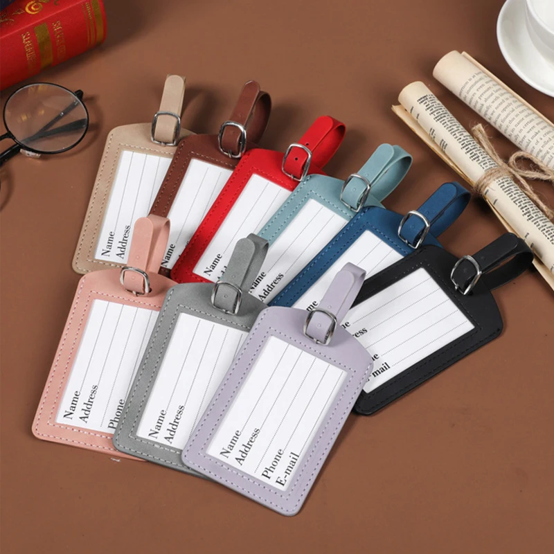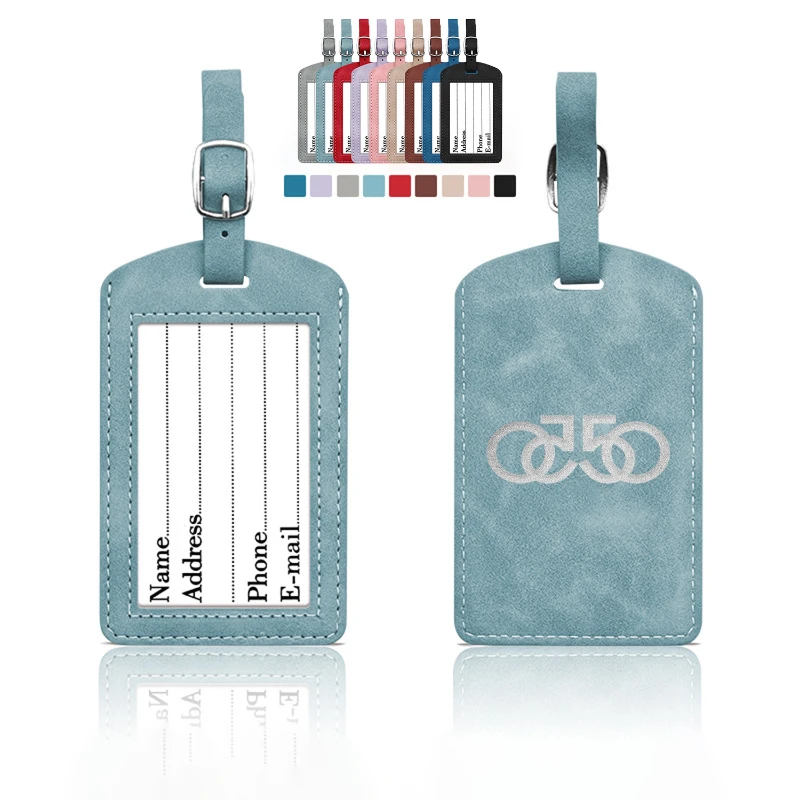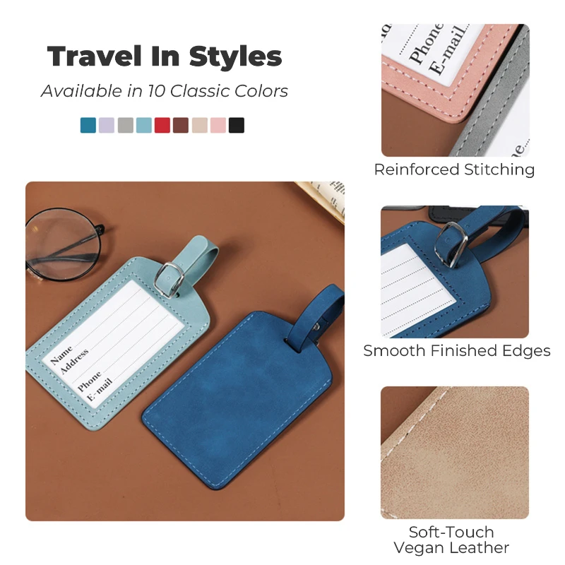 Crafted from premium soft-touch vegan leather, this luggage tag features a smooth matte finish and a refined, minimalist look. The clear front ID window allows quick identification, while reinforced stitching and smooth finished edges provide added durability for frequent travel. Includes an adjustable strap with metal buckle for secure attachment to luggage, backpacks, or carry-ons. Measures approximately 4.52 x 2.75 inches. Ideal for upscale travel programs, corporate gifting, or branded promotions. Each tag comes with a removable information card.