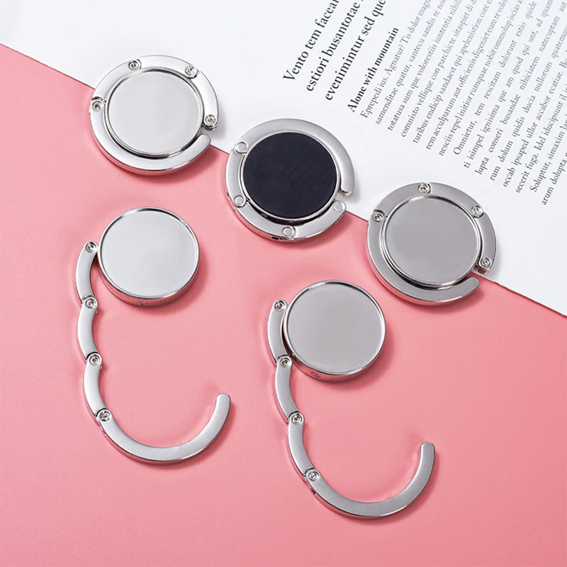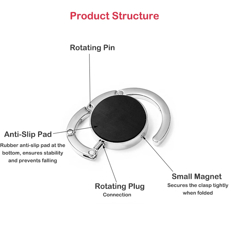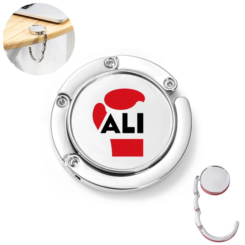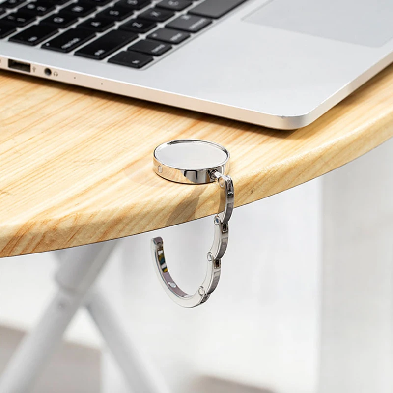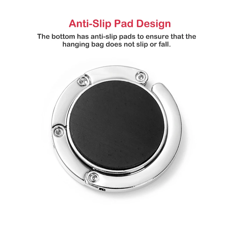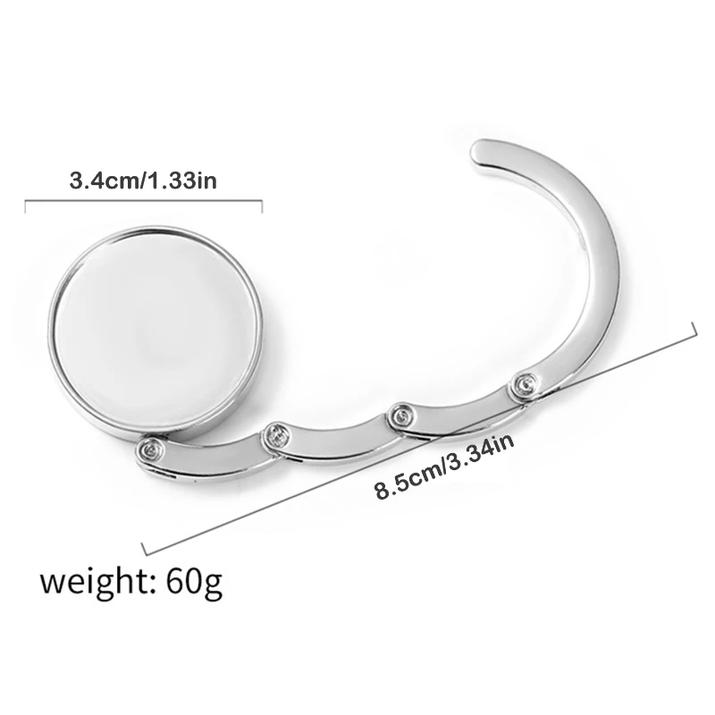 This compact and stylish purse hanger is crafted from durable zinc alloy, providing both strength and elegance. With a diameter of 1.33 inches and a length of 3.34 inches when extended, it offers a practical solution to keep your handbag clean and secure by hanging it on the edge of a table. The anti-slip pad on the base ensures stability, preventing your bag from slipping or falling. The foldable design with a small magnet allows for easy storage and portability, making it an ideal accessory for daily use or travel. Perfect for promotional events, this purse hanger is a functional and sophisticated gift.
