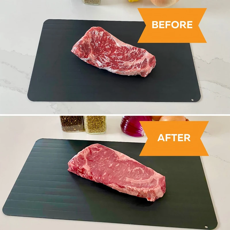 This aluminum Fast Defrosting Plate set is a versatile kitchen essential for quick thawing of beef and other meats. With dimensions of 11.61in x 8.19in x 0.79in, it offers efficient defrosting and doubles as a cutting board. The sturdy aluminum construction ensures durability, while its multifunctional design makes it perfect for various kitchen tasks.