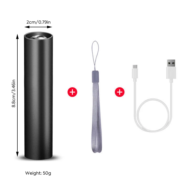 This compact and durable rechargeable flashlight is perfect for both outdoor and everyday use. Crafted with a premium aluminum alloy body, it is lightweight, waterproof, and resistant to wear and tear. Equipped with a high-power XPE LED, it offers three lighting modes: high, low, and strobe, with an adjustable beam for focused or wide-area lighting. The flashlight features a built-in rechargeable battery, easily charged via USB, and provides 1-3 hours of continuous illumination. Its pocket-sized design, measuring 3.46 inches long and weighing 0.11 lbs, ensures portability. Includes a wrist strap and charging cable.