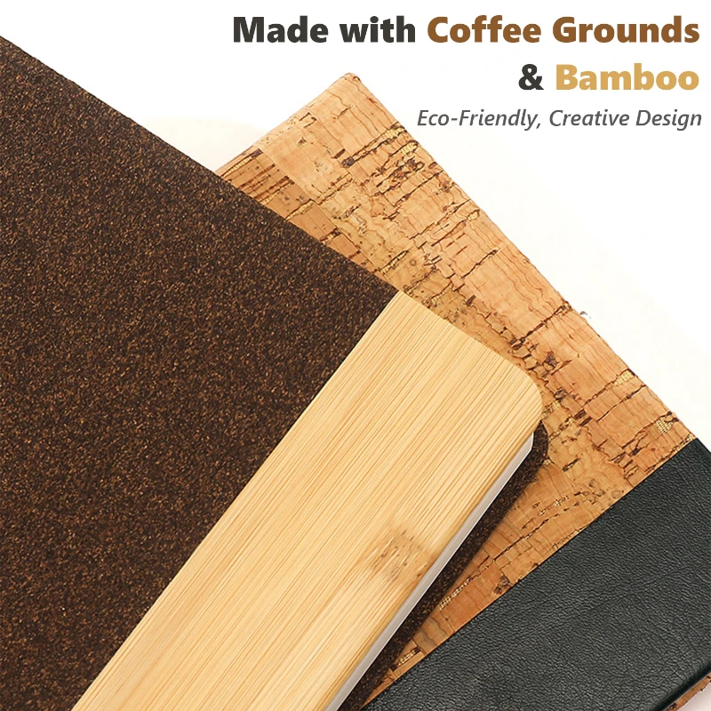This eco-friendly A5 notebook combines natural coffee grounds and bamboo grain leather for a distinctive, sustainable design. Measuring 8.46 × 5.78 inches, it includes 180 pages of 100 gsm lined paper for smooth, clean writing. A built-in ribbon bookmark keeps your place, while the sturdy hard cover offers durability for daily use. Ideal for offices, schools, or events promoting green values, this notebook makes an excellent corporate gift or eco-conscious promotional item.