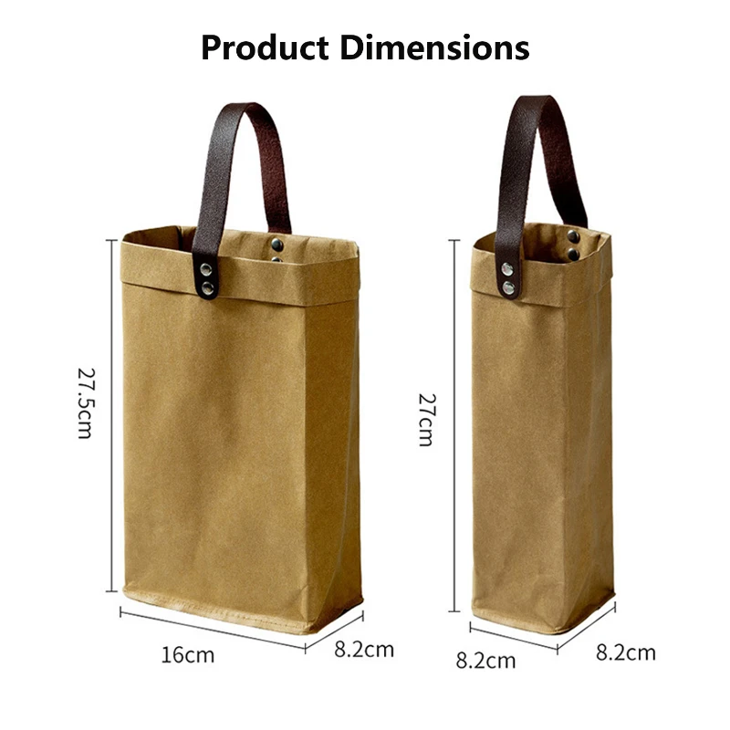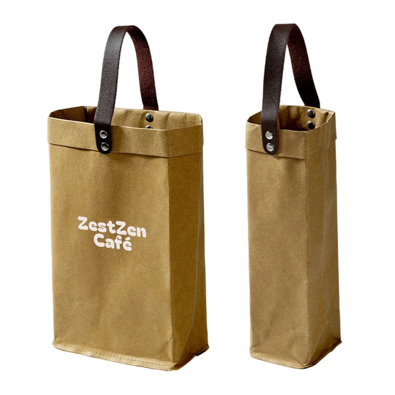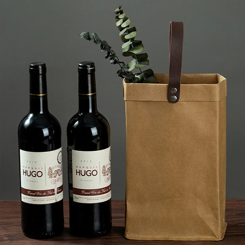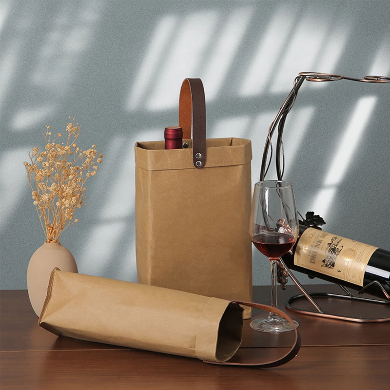 This versatile wine bag comes in two sizes: L for two wine bottles and S for one. Crafted from washable kraft paper, a natural fiber pulp, it’s eco-friendly, non-toxic, and recyclable. It combines the sturdiness of kraft paper with water-resistant, dry-cleanable features. Water-resistant, moisture-proof, and stain-resistant, it boasts meticulous stitching and a sturdy base. Its multi-purpose design accommodates wine, flowers as a centerpiece, or a variety of other items.