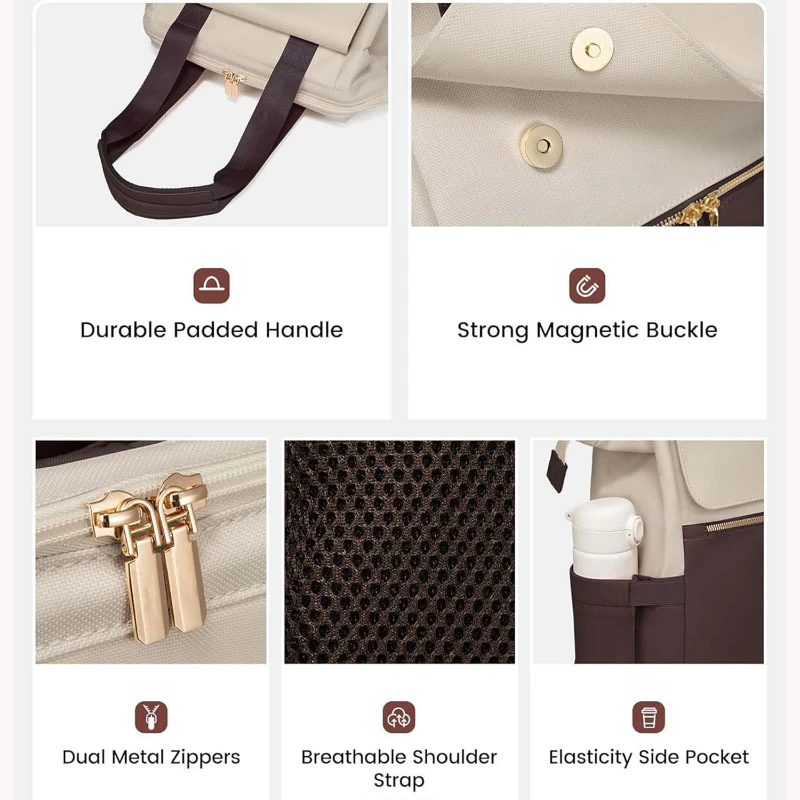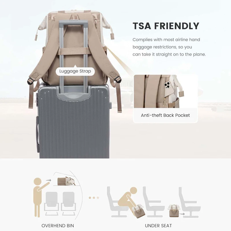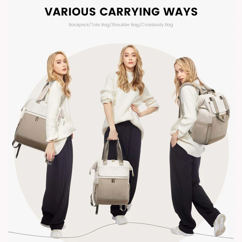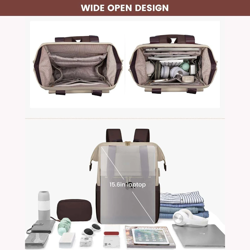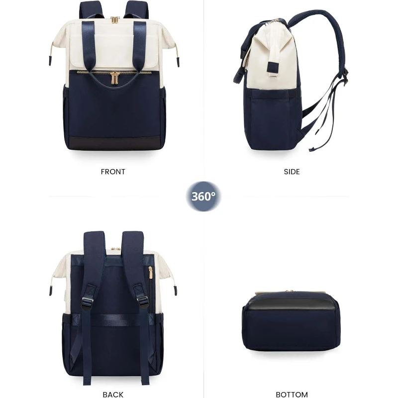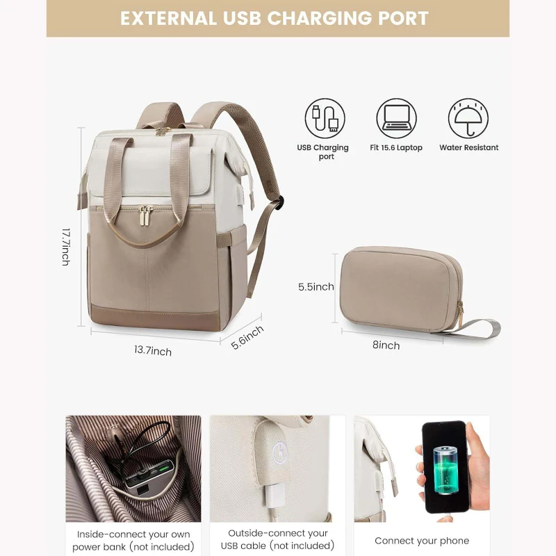 This sleek colorblock travel laptop backpack is designed for women who need style, organization, and versatility on the go. Made from durable Oxford fabric and polyester, it features a structured wide open main compartment with a padded sleeve that fits laptops up to 15.6 inches. The interior includes 16 organized pockets for electronics, documents, and daily essentials. Features include a magnetic flap closure, dual metal zippers, padded top handle, breathable shoulder straps, elastic side pocket, anti theft back pocket, and rear luggage strap. An external USB charging port allows convenient charging using your own power bank not included. TSA friendly size fits under seat or overhead bin. Includes a zippered storage pouch for accessories, cables, or personal items. Ideal for travel, commuting, college, and corporate gifting. Backpack size approx 17.7 x 13.7 x 5.6 inches. Pouch size approx 8 x 5.5 inches.