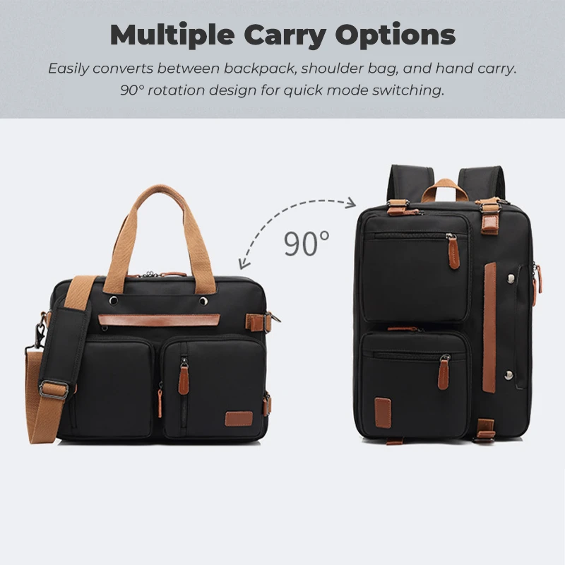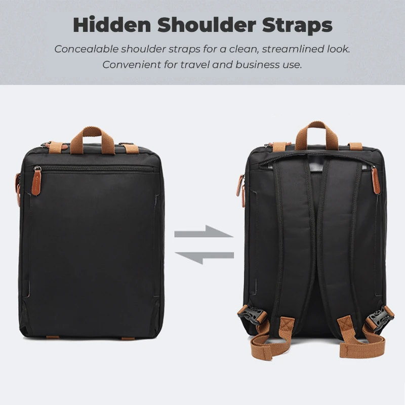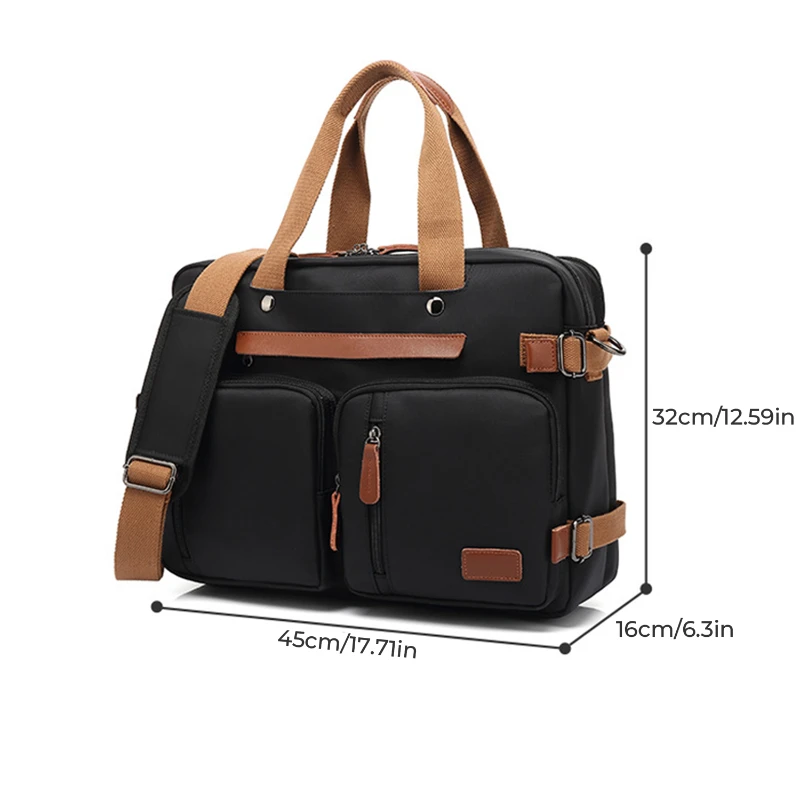 Designed for business travel and daily commuting, this multi-function backpack offers a refined, high-end look with generous storage capacity. Constructed from durable canvas and nylon, it features a structured, water-resistant surface that helps protect contents from everyday moisture and wear. The spacious interior includes a padded laptop compartment that fits up to a 16-inch laptop, along with multiple organizer pockets for documents, clothing, and accessories. The convertible design allows use as a backpack, shoulder bag, or hand-carry brief, with hidden shoulder straps for a clean profile when not in use. Additional features include reinforced top handles, a removable shoulder strap, and a rear luggage pass-through strap for rolling suitcases. Overall size is approximately 17.7 x 12.6 x 6.3 inches. Each backpack is individually polybagged.