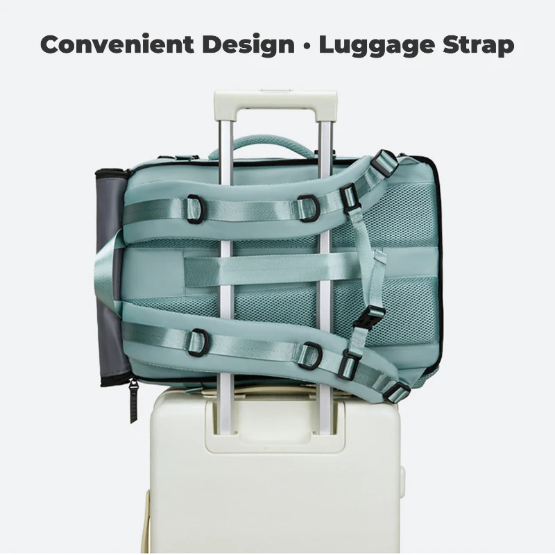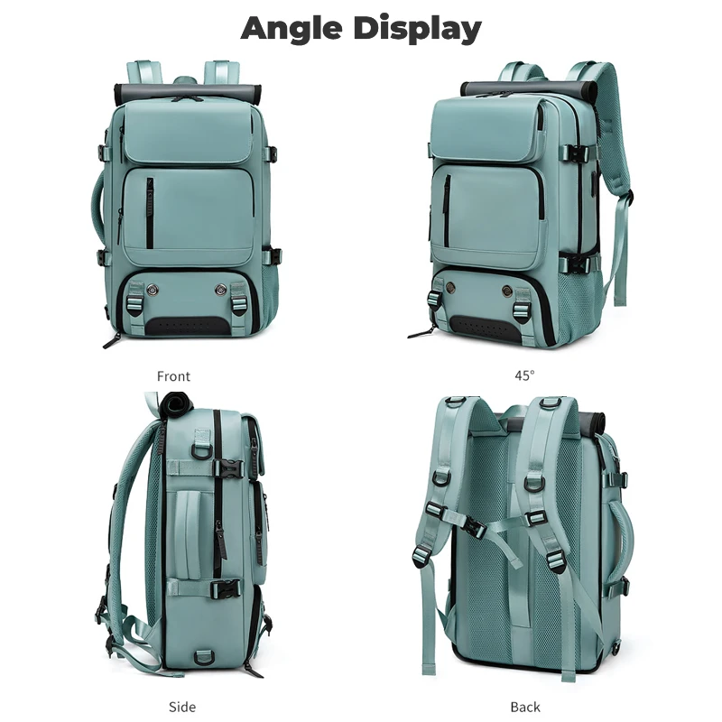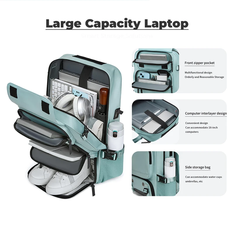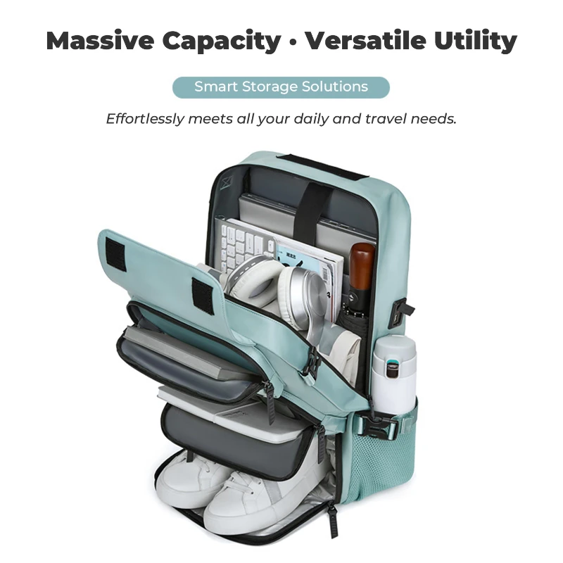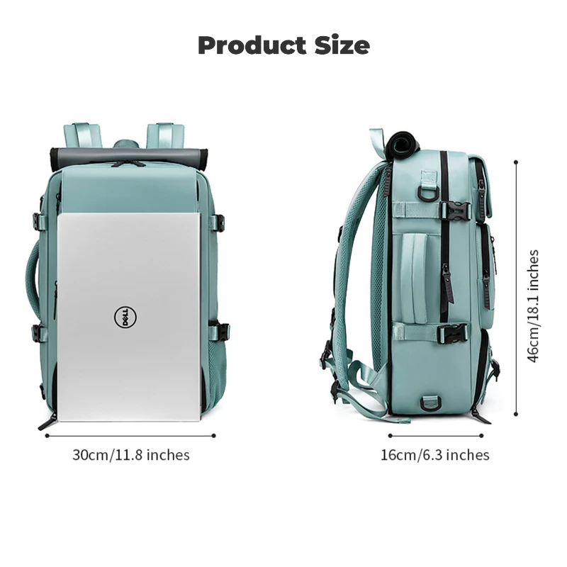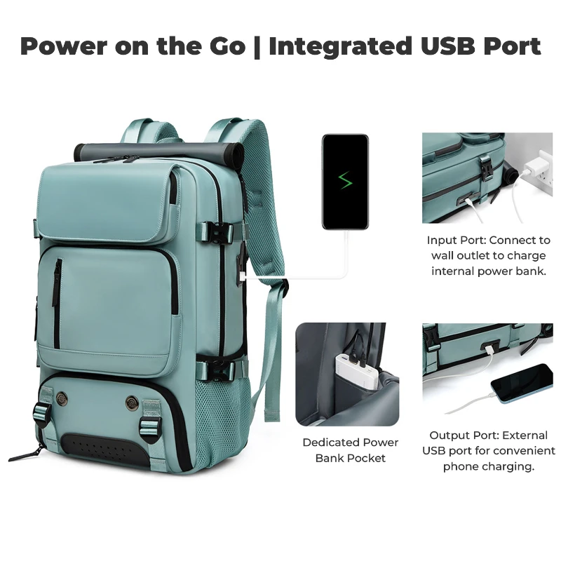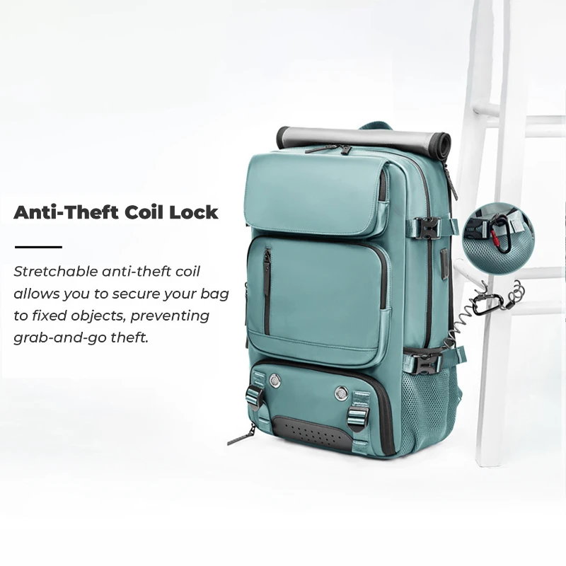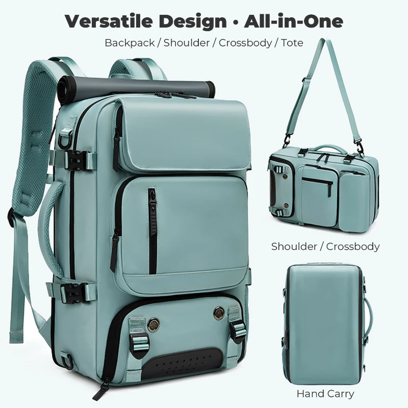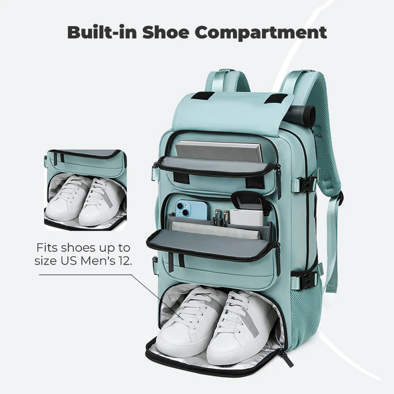 This large capacity travel backpack is made from durable water repellent Oxford fabric for daily commuting and travel. Measures 18.1 H x 11.8 W x 6.3 D inches and fits laptops up to 16 inches. Features a built in security coil lock to secure the bag to fixed objects, dedicated shoe compartment fits up to US Mens 12, multiple front zipper pockets, side mesh pocket, and padded laptop sleeve. Converts to backpack, shoulder, crossbody, or hand carry. Integrated USB port with internal power bank pocket.