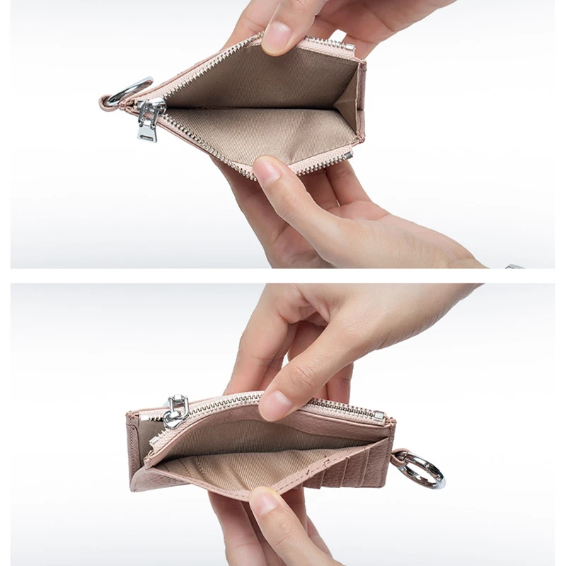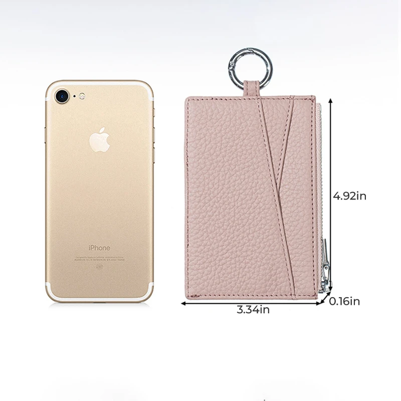 This slim multifunction card holder wallet is made from top grain leather with a textured litchi pattern finish for a soft and durable feel. Designed with 4 card slots, 2 front bill pockets, 1 ID window, and 1 zipper coin pocket for storing cash, coins, cards, and small essentials. The compact size measures 4.92 x 3.34 x 0.16 inches, making it easy to carry in pockets or bags. Built with a sturdy metal key ring for convenient attachment to keys or bags. Ideal for daily use, travel, corporate gifts, trade shows, and promotional giveaways. Available in Black, Brown, Light Blue, Pink, Yellow, and Green.