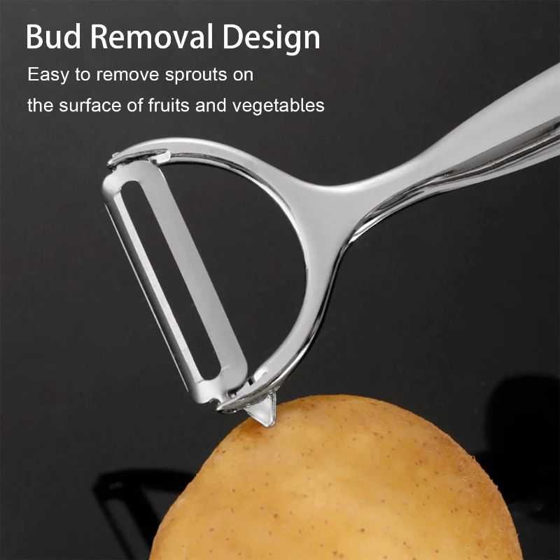 Kitchen peeler-used for vegetable and fruit peelers, most suitable for potatoes, apples, pears, tomatoes, carrots, cucumbers, etc. Built-in potato eye remover. Ultra-sharp wide swivel blade can maintain minimal resistance when peeling, and perfect fit the fruit or vegetable skin, won’t clog with peels, save both time and labor!