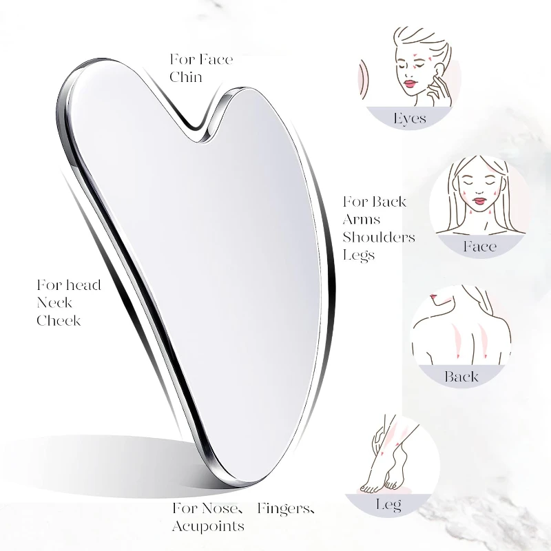 The gua sha tool is made of quality stainless steel material, steady and reduce friction for sensitive support, polished to the mirror surface, smooth and easy to clean; It’s an upgrade to the traditional gua sha stone; The facial massage tool is nice for facial SPA, the smooth edges of scraper ensure gently touching your skin without hurting while massaging your face accurately. Gua sha massage tool for whole body, it can be applied to the face, back, legs, wrists, arms, necks, and even the shoulders; Release muscle tension and improve lymphatic drainage with gua sha massage ritual; There are effective functions of promoting blood circulation, treating soft tissue injury, removing dampness and relieving pain