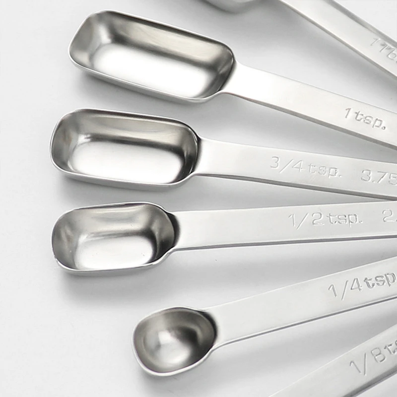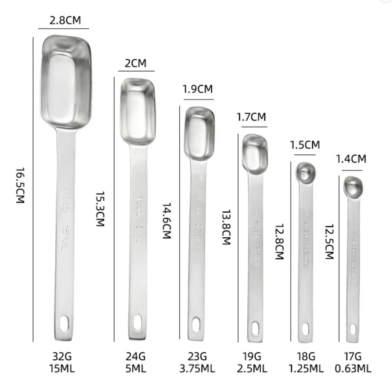 The Stainless Steel Measuring Spoon is a must-have for precise cooking and baking. Made from high-quality stainless steel, it is durable, rust-resistant, and built to last. Available in six different sizes: 1 tbsp (15 ml), 1 tsp (5 ml), 3/4 tsp (3.75 ml), 1/2 tsp (2.5 ml), 1/4 tsp (1.25 ml), and 1/8 tsp (0.63 ml), this spoon ensures accurate measurements for all your culinary needs. Each spoon is clearly marked with both metric and imperial measurements. The rectangular shape allows for easy scooping of ingredients from narrow jars. Please note: the prices for the 5 ml, 3.75 ml, and 2.5 ml sizes are the same, and the prices for the 1.25 ml and 0.63 ml sizes are the same. The website price is for a single spoon, not a set of six.
