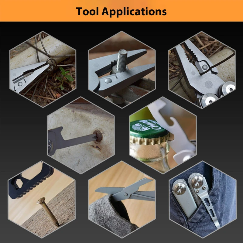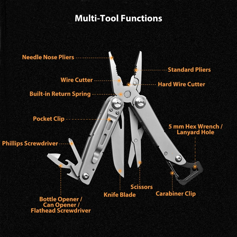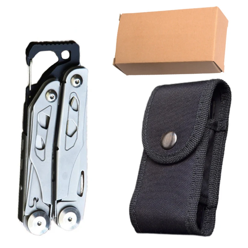 This compact multi-tool is made from durable 420 stainless steel, offering reliability for outdoor, emergency, and everyday use. Measuring 4.53 x 1.69 x 0.91 inches when closed and extending to 6.81 inches when open, it weighs 0.58 lb. Features include needle nose pliers, standard pliers, wire cutter, hard wire cutter, knife blade with a 2.95-inch edge, scissors, Phillips and flathead screwdrivers, bottle and can opener, hex wrench, and carabiner clip. Designed with a built-in return spring and pocket clip, it is convenient for on-the-go use. Each tool comes packaged in a pouch with a box.