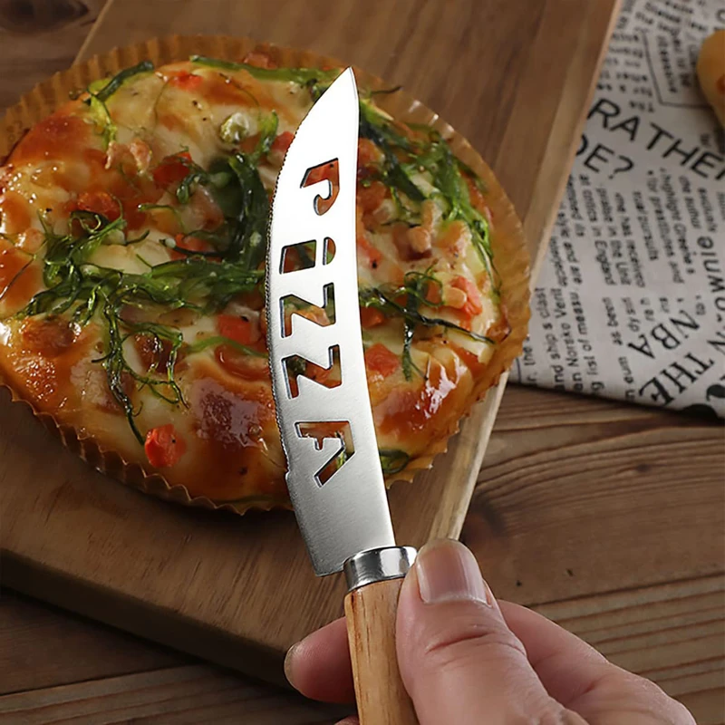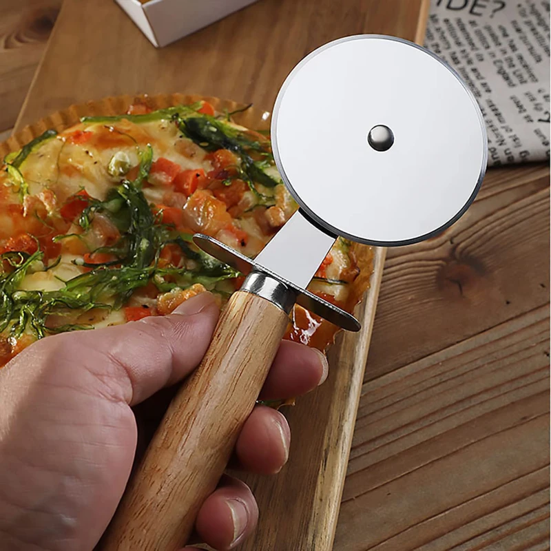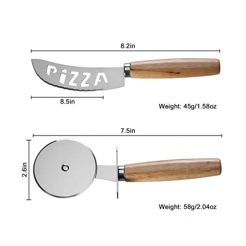 Crafted from stainless steel, this set features a wheel cutter and a pizza knife, both with ergonomic wooden handles for a comfortable, steady grip. The pizza knife’s serrated edge and 8.2-inch blade are engineered to smoothly cut through crusts and toppings with precision, while the wheel cutter’s 2.6-inch wheel provides quick and clean cuts. Each tool has a weight of approximately 1.58 ounces and 2.04 ounces respectively, balancing heft and ease of use. Available as a set or individually, these utensils are not only perfect for slicing pizza but also versatile enough for cutting pastries, flatbreads, and sandwiches. With their natural wooden handles, they add a touch of warmth to any kitchen’s aesthetic.