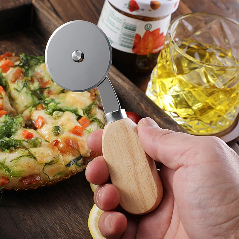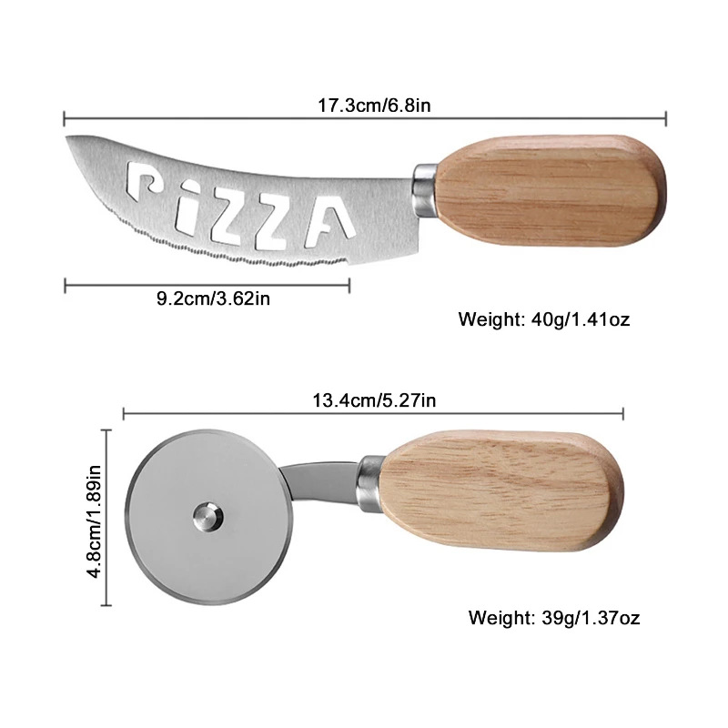 Featuring a classic wooden handle design that brings a touch of rustic elegance to your kitchen. This set includes a durable stainless steel pizza knife and a wheel cutter, each boasting a comfortable wooden grip. The pizza knife measures 6.8 inches in length with a 3.62-inch blade and weighs 1.41 ounces, while the wheel cutter spans 5.27 inches with a 1.89-inch wheel, weighing 1.37 ounces. Both tools are ideal for effortlessly cutting through a variety of pizza crusts. Available for individual purchase or as a combination set, these cutters make a functional and aesthetically pleasing addition to any pizza night.