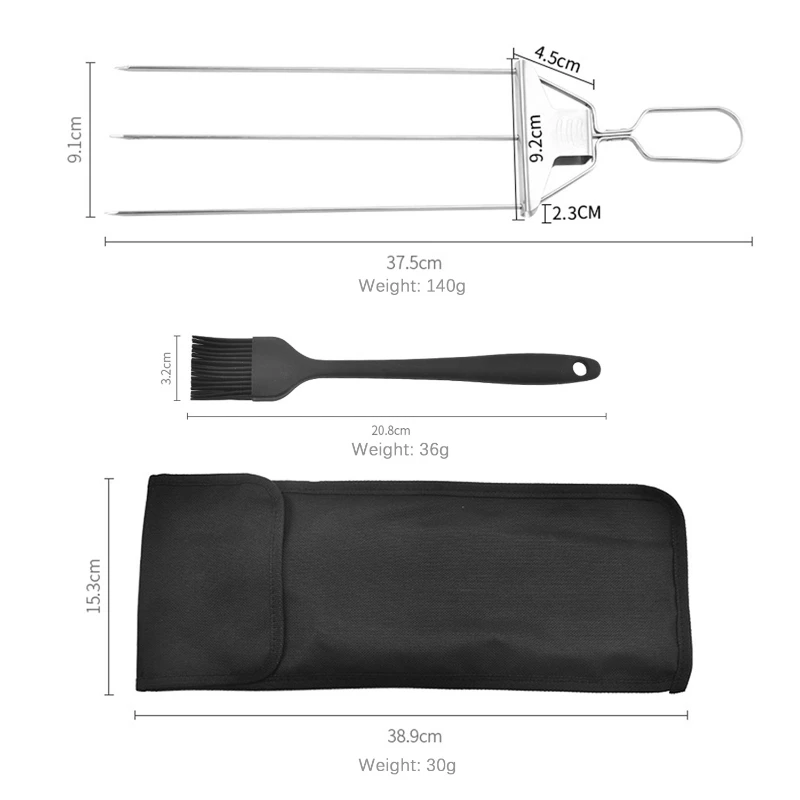 Enhance your grilling experience with the Stainless Steel Semi-Automatic BBQ Fork. This innovative tool features a tri-pronged design for efficient and uniform cooking of meats and vegetables. Made from durable 430 stainless steel, it offers superior strength and resistance to rust. The semi-automatic mechanism allows for easy handling and quick release of food, ensuring a hassle-free grilling session. The fork is accompanied by a high-quality Oxford cloth bag for convenient storage and portability, and a silicone brush for precise basting. Perfect for outdoor barbecues, family gatherings, and camping trips.