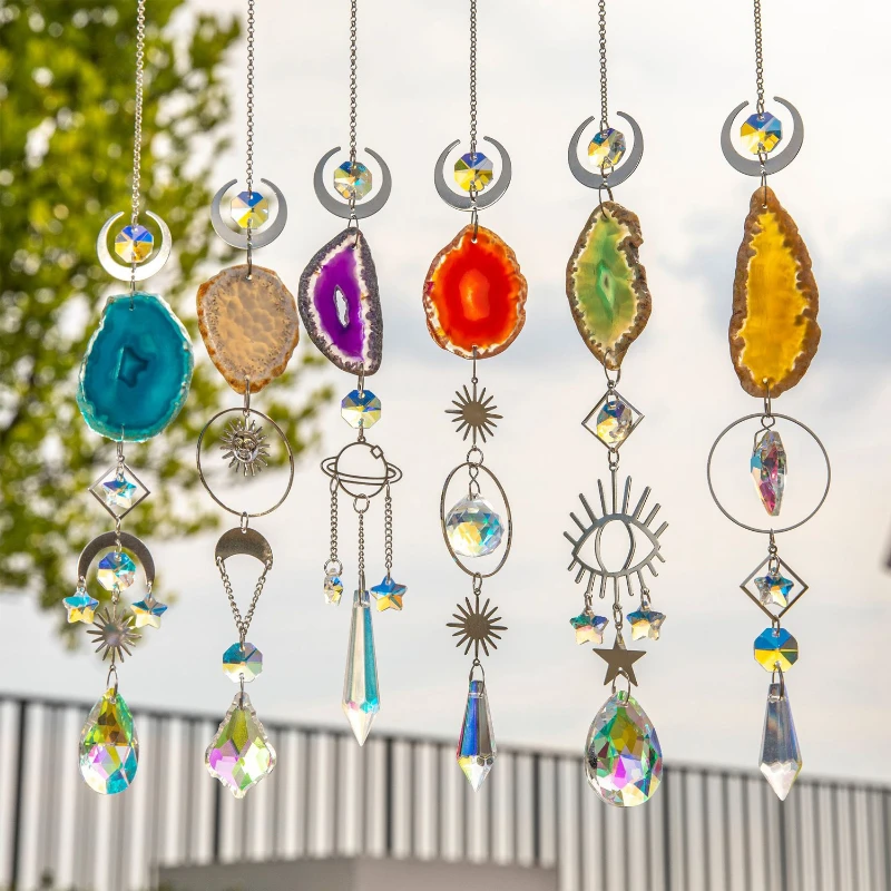 Agate and Crystal Pendant, handcrafted from raw agate and crystals, adds a touch of natural elegance to your space. Whether used as a mesmerizing light fixture or a decorative ornament hanging by your bedside or window, it creates a captivating ambiance. When exposed to sunlight, the crystals refract enchanting rainbow colors, enhancing the beauty of your surroundings. The pendant measures approximately 3.15 inches. Please note that each piece is crafted from natural raw stones, making it a unique, one-of-a-kind creation.