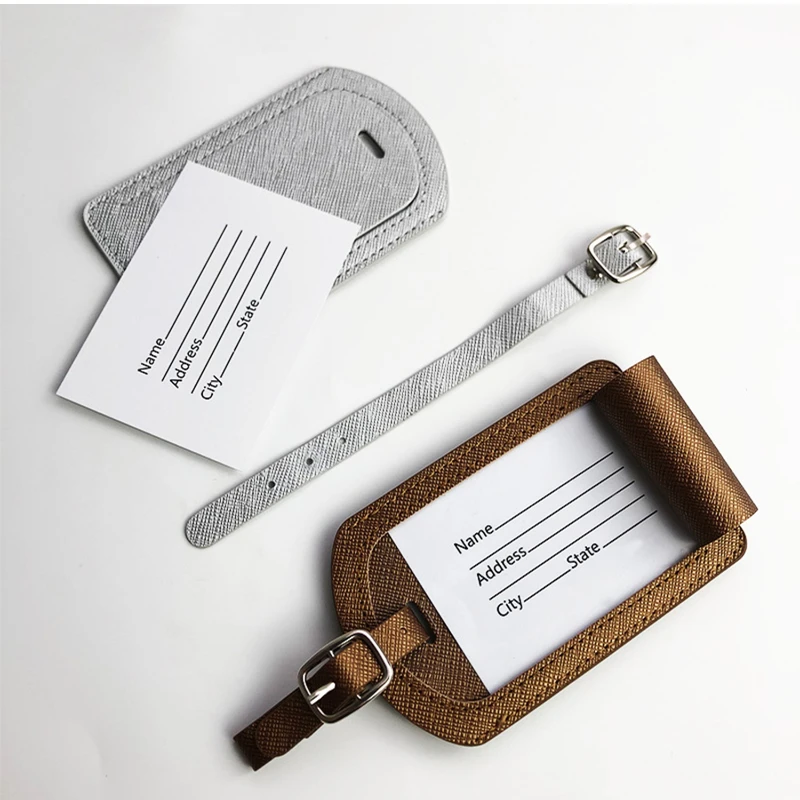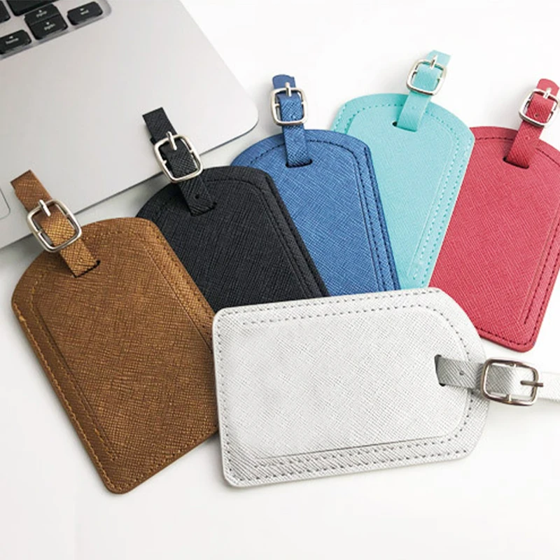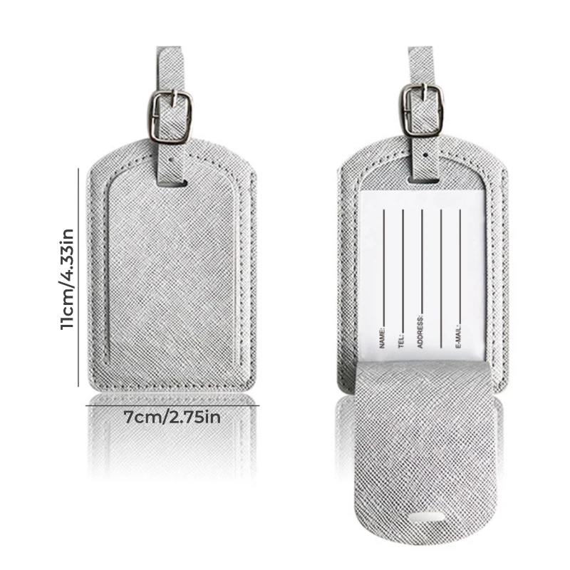 This business style luggage tag features a classic crosshatch texture with a clean, professional look. Made from smooth Vegan Leather, it offers durability with a soft, flexible feel for frequent travel use. The hidden flap design protects personal information while allowing easy access to the included ID card when needed. Finished with reinforced stitching and an adjustable strap with metal buckle for secure attachment to suitcases or carry ons. Tag size is approximately 4.3 x 2.75 inches. Ideal for corporate travel, conferences, and branded giveaways.