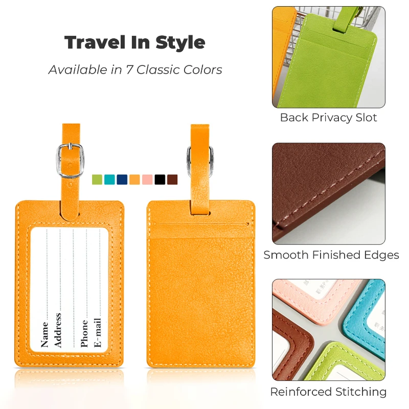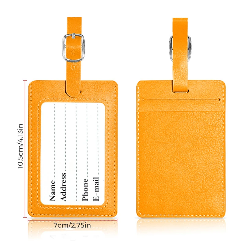 This classic luggage tag is made from thickened vegan leather with a soft-touch surface and reinforced stitching for long-lasting use. Features a clear front ID window for quick identification and a rear card slot for an additional business or transit card. Finished with smooth painted edges and an adjustable strap with metal buckle for secure attachment to suitcases, backpacks, or carry-ons. Measures approximately 4.13 x 2.75 inches. Ideal for travel programs, corporate gifts, or branded giveaways. Each tag includes a removable information card.