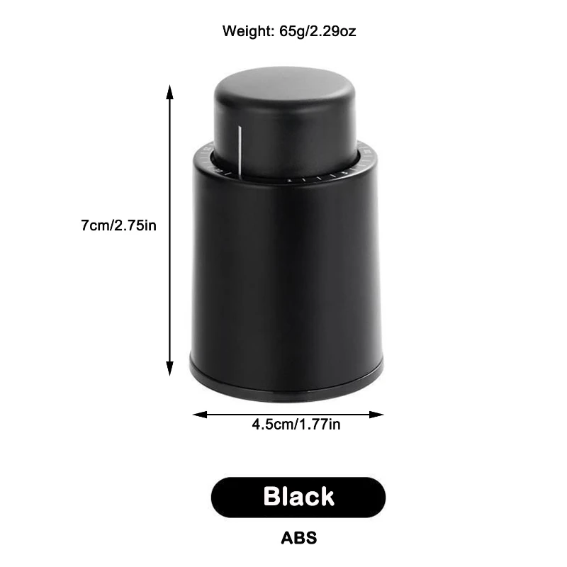 This stopper is available in two colors: black and silver, with each offering distinct material advantages. The black stopper is crafted from high-quality ABS, while the silver variant boasts durable stainless steel construction. Both designs feature slightly different dimensions and weights: the black stopper measures 2.75 inches in height and 1.77 inches in diameter, weighing 2.29 ounces; the silver stopper stands at 2.87 inches tall with a diameter of 1.81 inches, weighing 2.82 ounces. Ideal for any event or occasion, this stopper keeps your wine fresh by creating a tight vacuum seal, preventing oxidation. Its user-friendly design makes it easy to use and store, enhancing your wine experience.