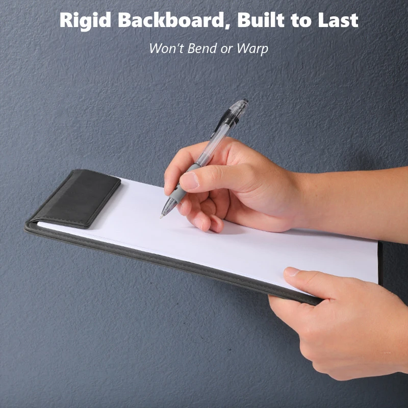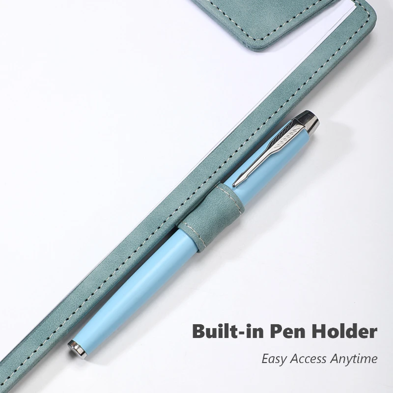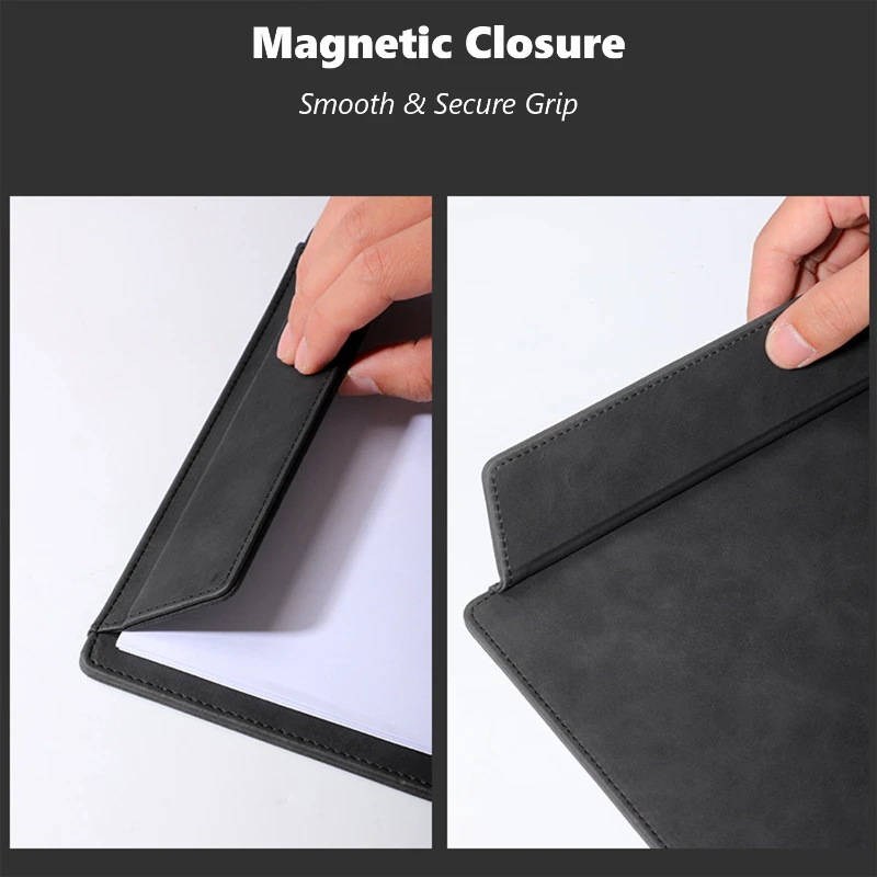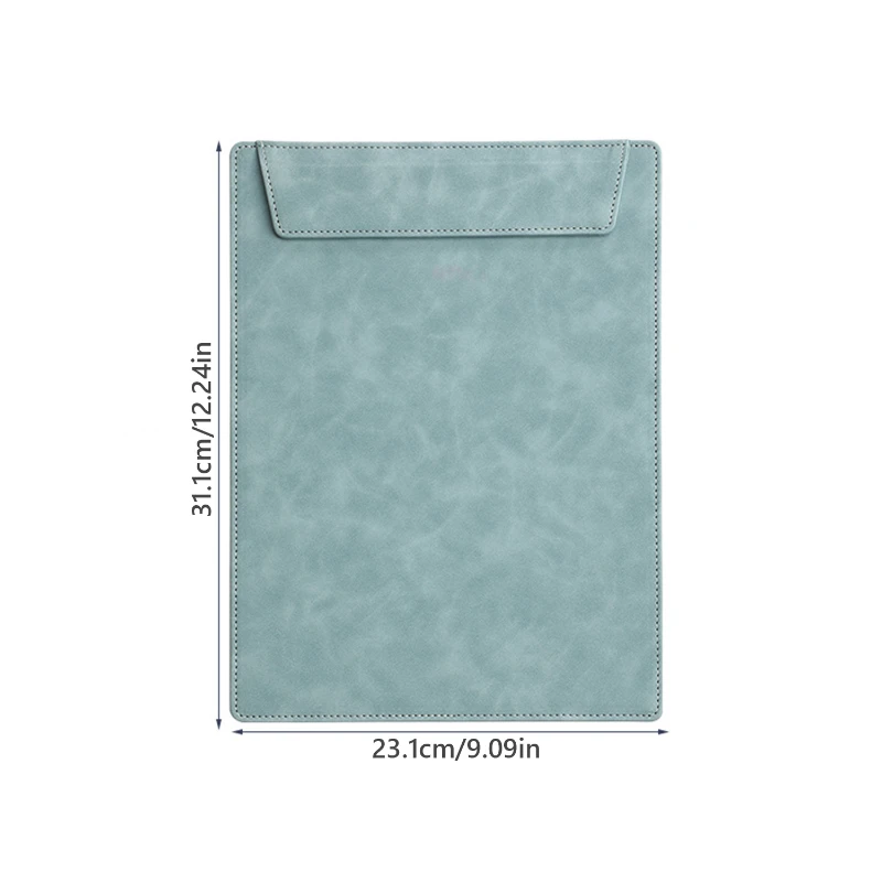 This A4 writing pad clipboard is made with smooth vegan leather and features a rigid 3.5 mm backboard that resists bending during daily use. The magnetic closure keeps papers secure while the built in pen holder offers quick access on the go. Measuring about 12.24 in by 9.09 in, it provides a clean and stable surface for writing in meetings, events, classrooms, and field work. It is suitable for office staff, hospitality teams, and trade shows. Available in multiple colors and ready for custom logo decoration.