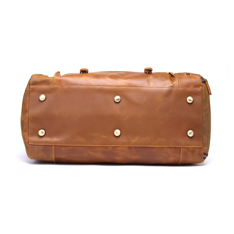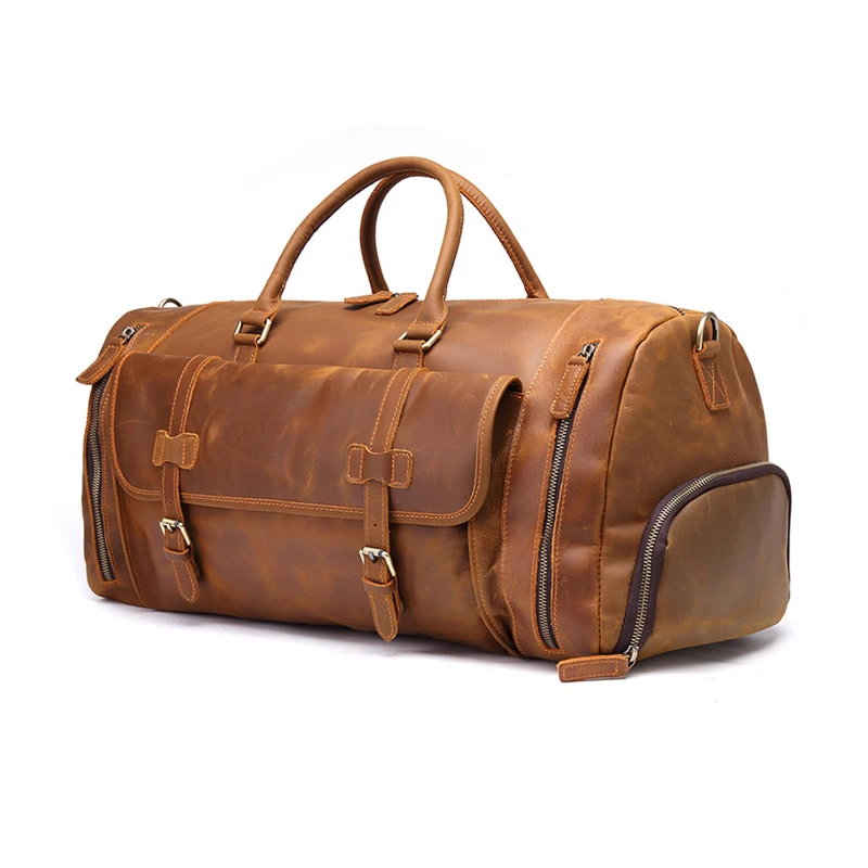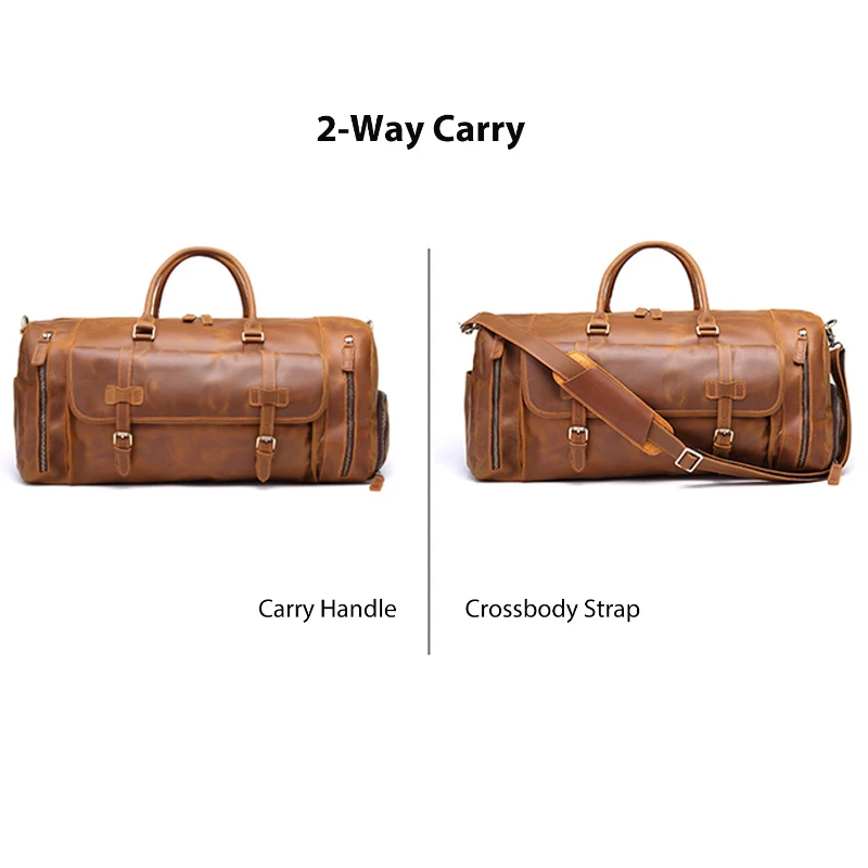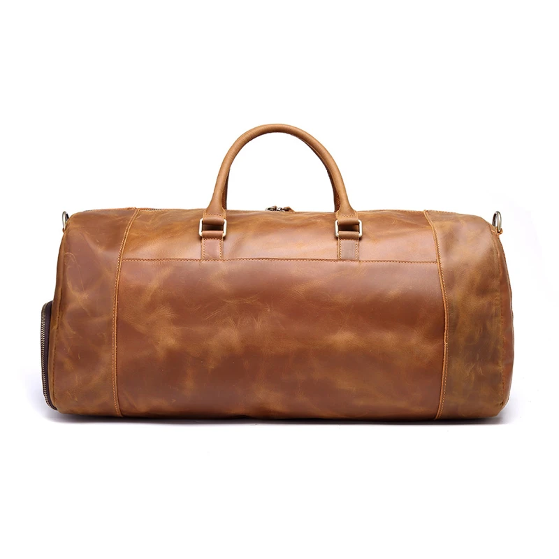 Crafted from full-grain crazy horse leather, this vintage-style duffel bag is designed for durability and timeless appeal. Measuring 19.7 x 11.8 x 10.8 inches and weighing 6.26 lb, it offers a spacious main compartment with multiple pockets to organize travel essentials. The bag features sturdy carry handles and a detachable, adjustable shoulder strap for versatile use as a handbag or crossbody. Reinforced stitching, quality hardware, and natural leather grain enhance its rugged charm. Ideal for business trips, weekend getaways, or long-distance travel.
