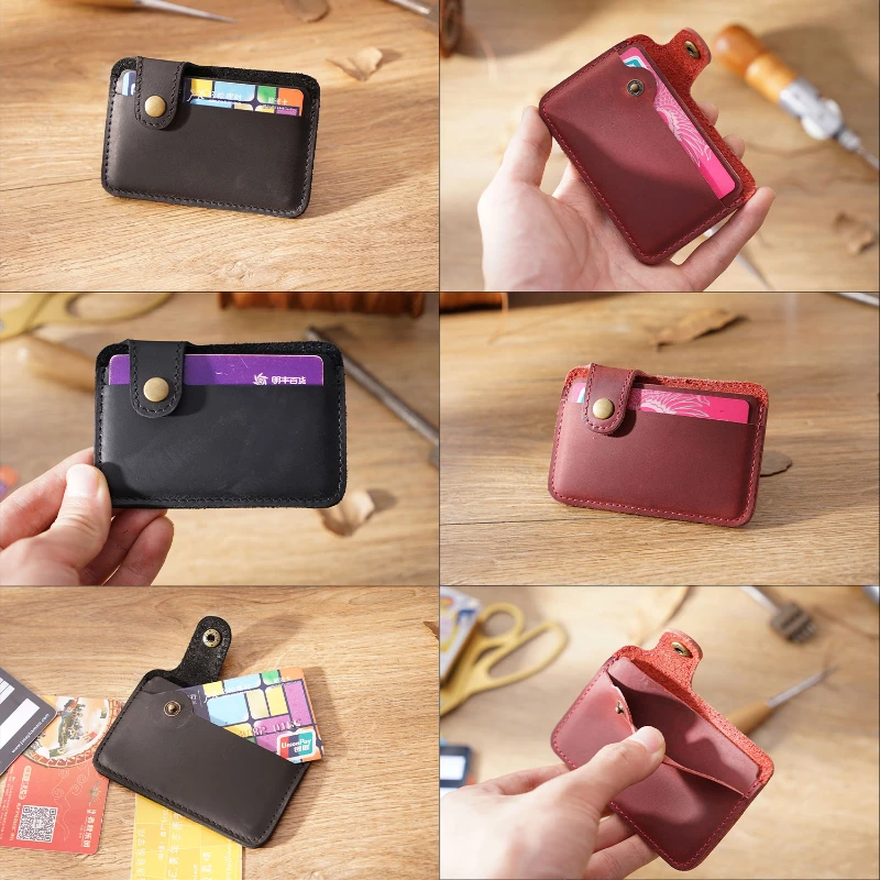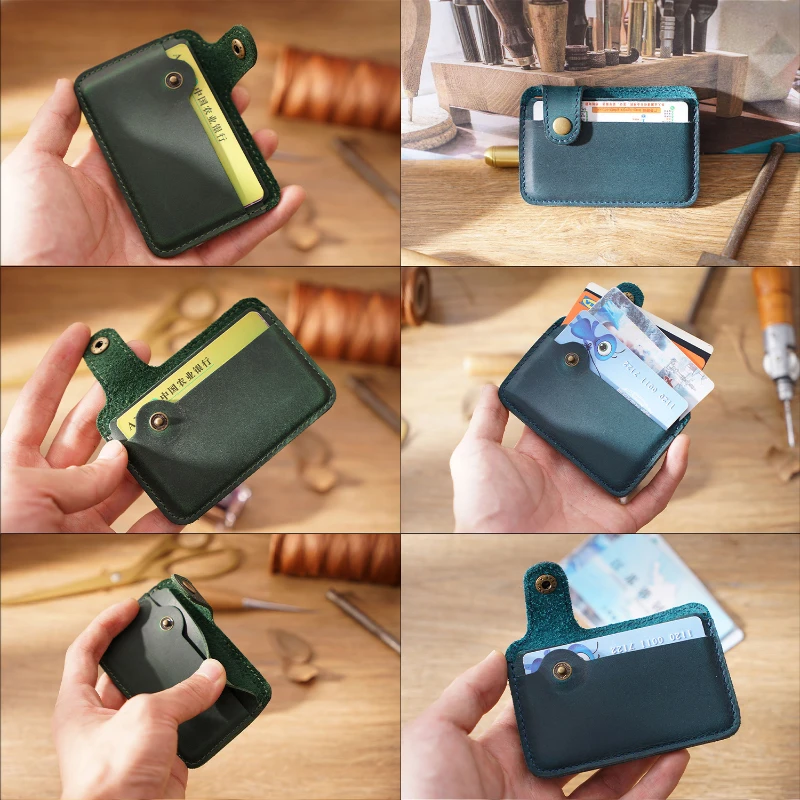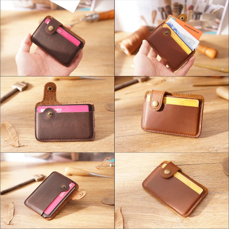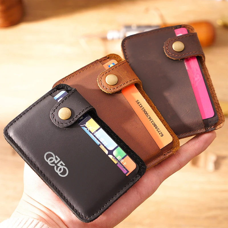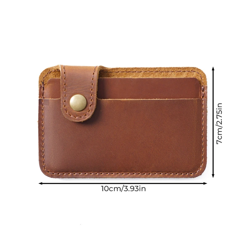 Compact card holder wallet made from full-grain cowhide leather with a smooth vintage finish for a classic look and long lasting durability. Measures 3.93 x 2.75 inches and weighs about 0.9 oz, making it ideal for pocket carry, travel, or daily use. Features a secure snap tab closure and two card slots that can hold multiple bank cards, ID cards, or business cards. Strong stitching and sturdy construction provide reliable performance. Ideal for trade shows, corporate gifts, employee giveaways, and promotional programs. Available in Brown, Coffee, Black, Blue, Green, and Red.