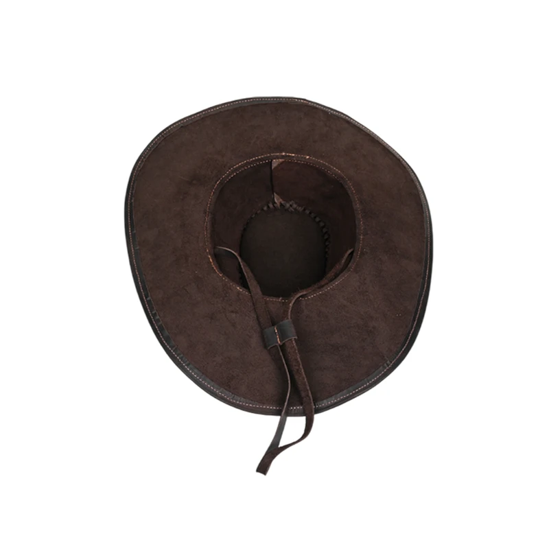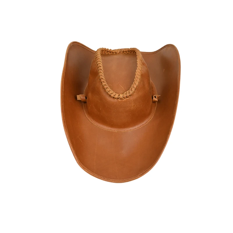 Crafted from premium crazy horse leather, this vintage-inspired Western cowboy hat offers durability and timeless style. Featuring an intricately woven crown edge and a wide brim, it provides excellent sun protection and a rugged look. Suitable for outdoor enthusiasts, ranchers, or themed events, this hat blends functionality and charm. Designed to fit a 23.6-inch head circumference, it weighs approximately 0.97 pounds. Available in rich brown tones, it makes a perfect accessory for Western-themed outfits.