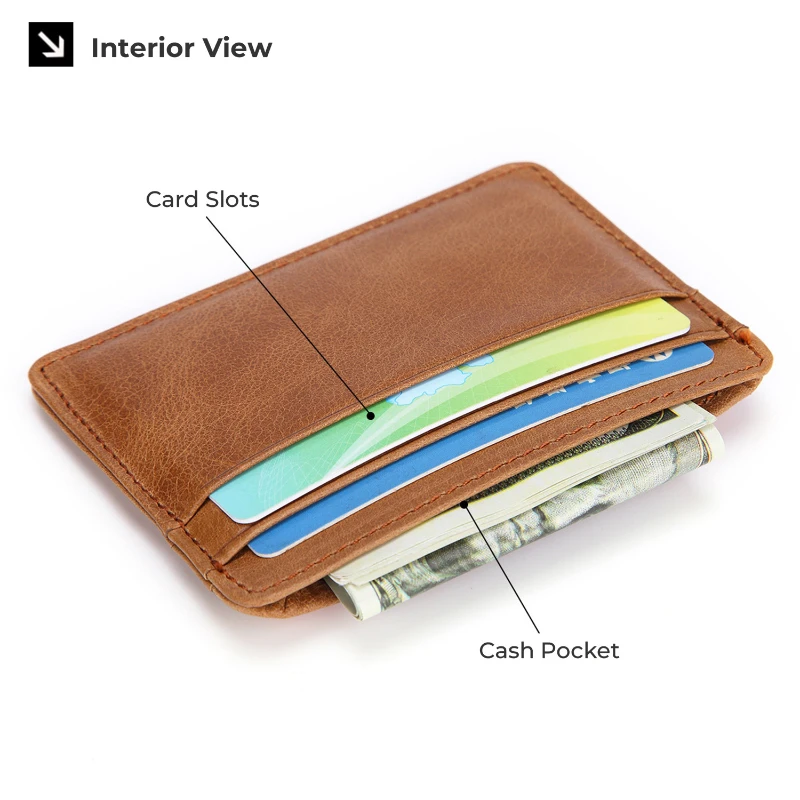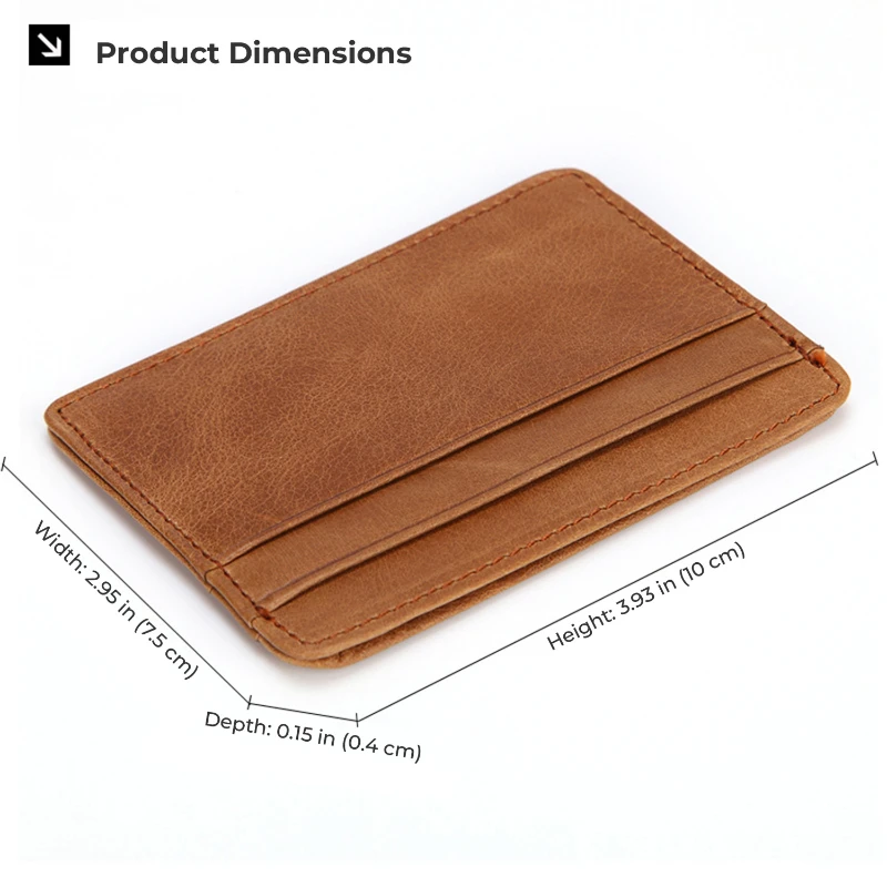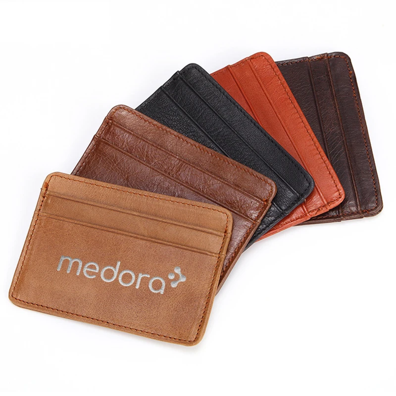 This slim leather card holder wallet is made from genuine cowhide leather with an oil wax finish that gives a classic vintage look. Designed with multiple card slots and a center cash pocket, it can hold 4 to 7 bank cards along with folded bills and coins for daily use. The compact size measures 3.93 x 2.95 x 0.15 inches, making it easy to carry in front or back pockets. Ideal for business use, trade show giveaways, corporate gifts, and promotional events. Available colors include Black, Dark Blue, Dark Gray, Brown, Coffee, and Red.