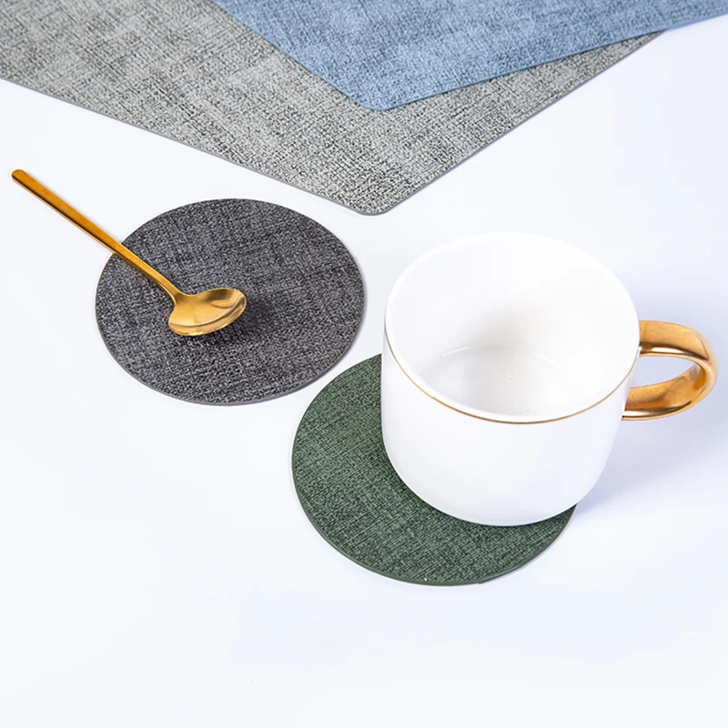 These coasters, featuring a refined fabric-like leather texture, combine fashion and functionality. They are designed to be heat-resistant and waterproof, protecting your surfaces from damage while adding a touch of elegance. Each set comes in a variety of sophisticated colors to match any decor. These coasters are not only practical but also easy to clean, making them perfect for both home and hotel use. Enjoy a stylish and tidy space with these beautifully crafted coasters.
