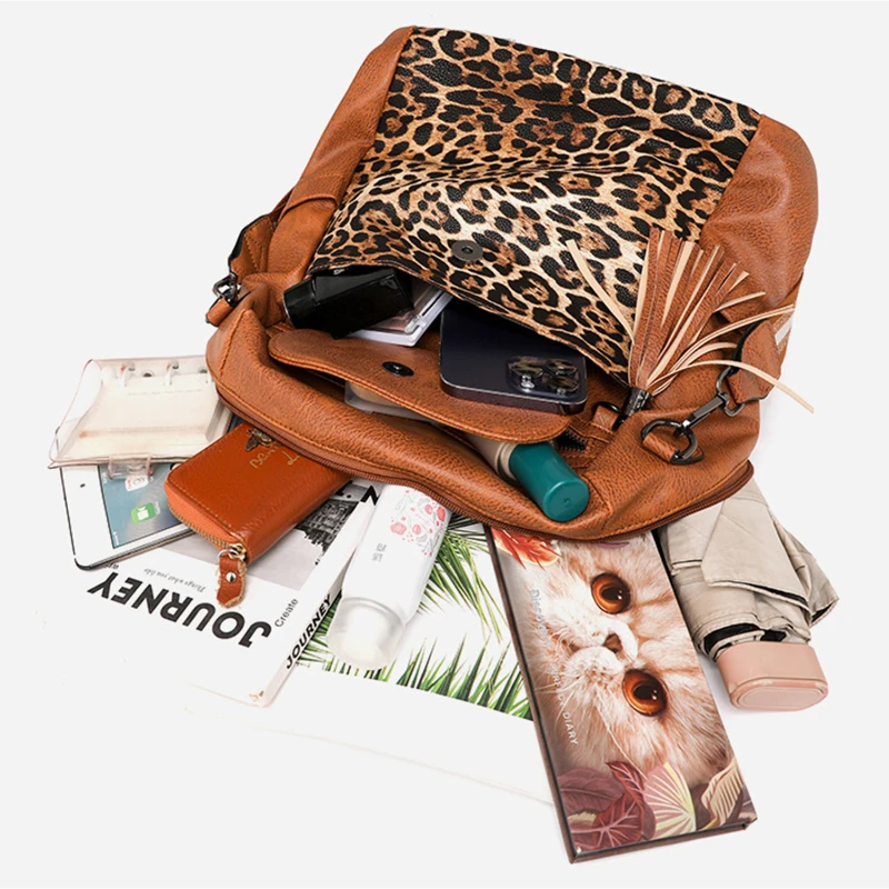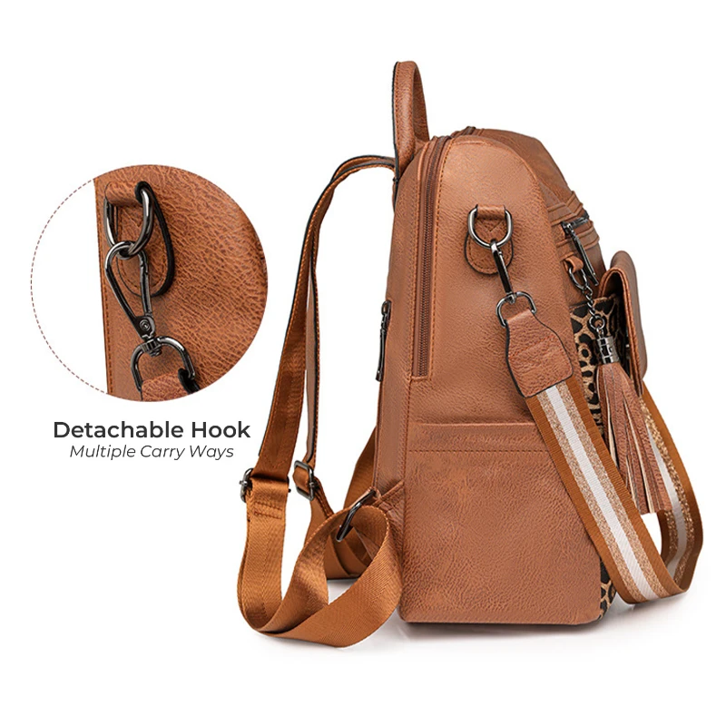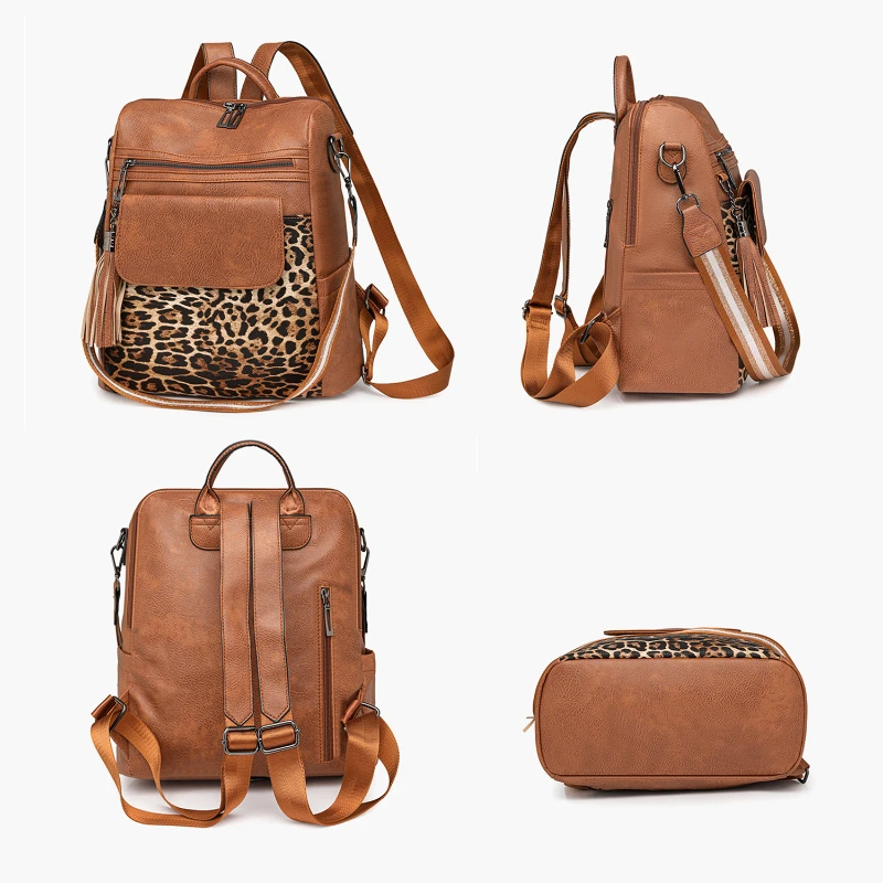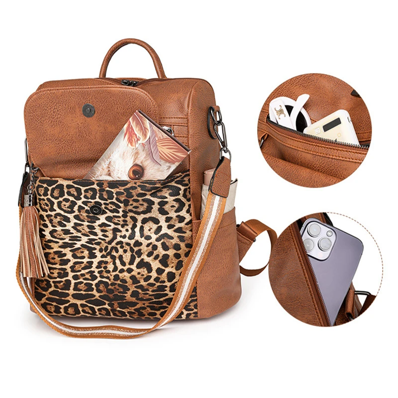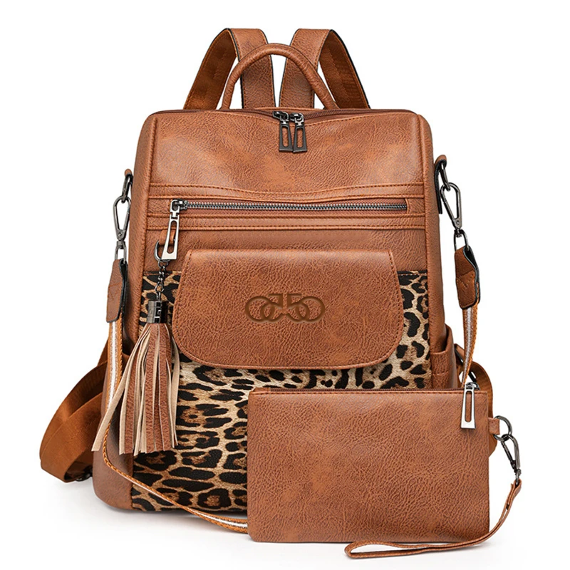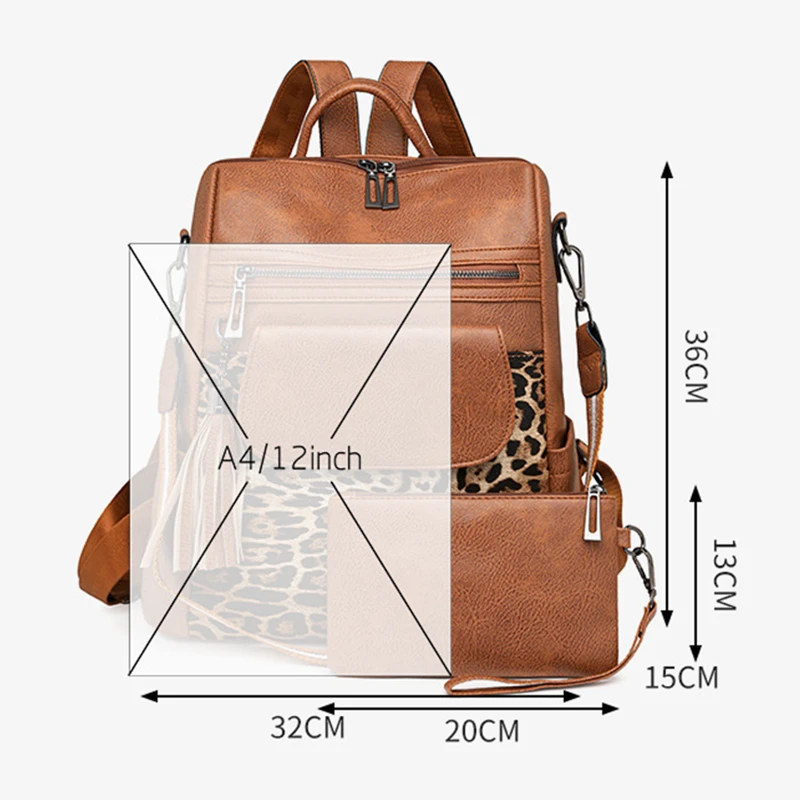 This vintage style backpack set is made of textured vegan leather with a classic grain finish and includes a matching wristlet pouch for extra storage. Sized at approx. 14.17 x 12.6 x 5.9 in, the bag fits A4 size items and daily essentials comfortably. Features include multiple zippered pockets, magnetic front pocket, interior compartments, and side pockets for organized storage. Adjustable straps allow use as a backpack or shoulder bag. Ideal for travel, commuting, school, and promotional giveaways.