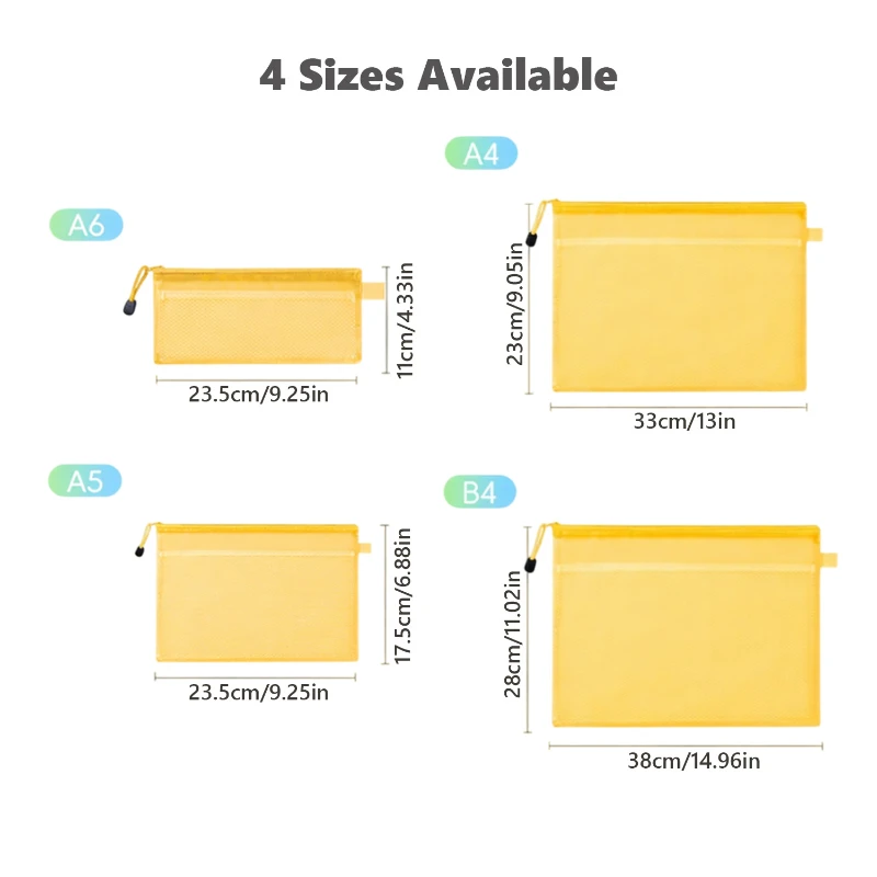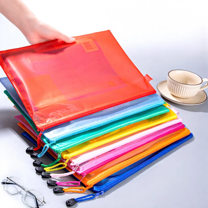 This waterproof zipper document pouch is designed for secure and organized storage of files, stationery, and daily essentials. Made from durable PVC material, it features a smooth semi transparent finish that helps identify contents at a glance while protecting them from spills and moisture. The sturdy zipper closure keeps items safely enclosed, and the built in mesh divider allows easy separation of papers, notebooks, calculators, or accessories. A4 size measures approximately 13 x 9.06 inches. Ideal for students, offices, travel, and document organization. Available in Pink, Blue, Light Blue, Green, Orange, Yellow, Red, and Rose Red. Offered in 4 sizes, with pricing based on the A4 size.