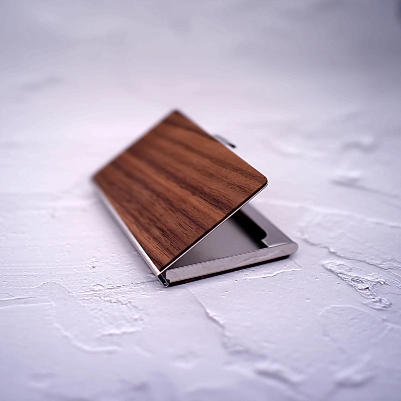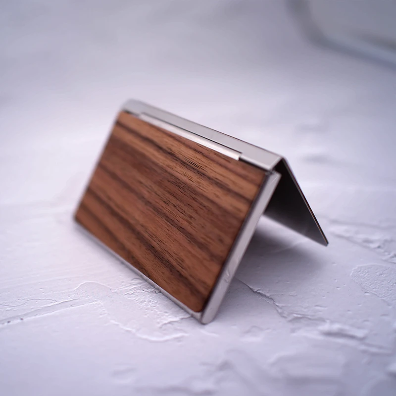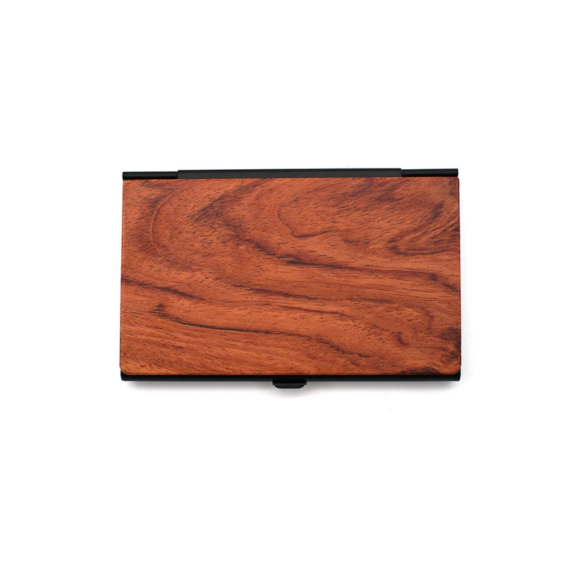 Crafted from premium wood and durable aluminum alloy, this sleek card holder measures 3.6 inches by 2.2 inches, ensuring a compact yet stylish design. Available in two edge finishes, silver or black, and offered in three distinct wood tones, this card holder adds a touch of sophistication to your daily essentials. Ideal for professionals, it securely holds your business cards, credit cards, or IDs. The secure clasp closure ensures your cards stay protected while enhancing your professional image.